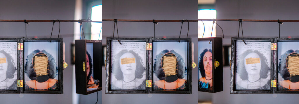 A exposição conta com instalações como “Eu tenho a tua cara”, com 49 rostos de mulheres que trocam olhos e bocas costurados, tensionando identidade e alteridade; “Caixa Preta”, que constrói um autorretrato expandido a partir de fotografias, intervenções têxteis e escritos; “Coso porque está roto”, que apresenta um casaco cujo avesso revela órgãos bordados que simbolizam sentimentos e acionam a ideia de reparo; “Entre nós”, que mergulha em objetos de crochê para problematizar tarefas naturalizadas no âmbito doméstico; e “Quem pariu, que embale”, que questiona a atribuição quase exclusiva do cuidado dos filhos às mulheres. A montagem do percurso expositivo, coordenada por Fábio Nunes, com produção executiva de Júlia Martins, propõe uma trajetória não cronológica, permitindo que o público construa sua própria experiência entre matéria, gesto e memória.